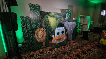 Transform your venue with our vibrant jungle backdrop and a full cast of jungle creatures, including a lion, hippo, elephant, alligator, rhino, and giraffe. These eye-catching props are crafted with attention to detail, giving your guests the feeling of walking through a tropical safari.